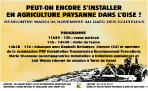 La Confédération paysanne de l’Oise est heureuse de vous inviter à sa rencontre « Peut-on encore s’installer en agriculture paysanne dans l’Oise ? », le mardi 04 novembre au GAEC des Écureuils (Les Saules Binet 27420 Authevernes).
